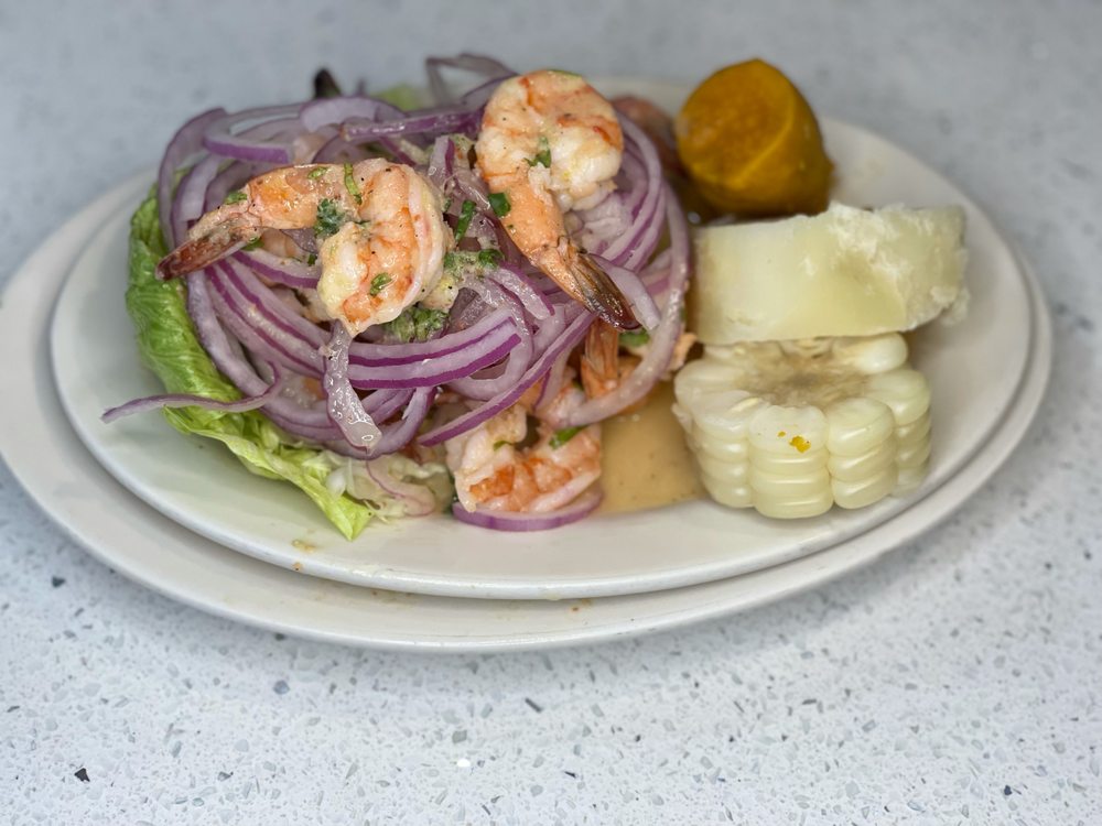 Tilapia fish, octopus, and shrimp cured in fresh citrus juices, most commonly lemon or lime, and spiced with aji, chili peppers or other seasonings, including chopped onions, salt, ginger, celery and milk.