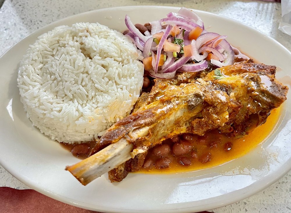 Beefsteak served over Peruvian canary beans, rice, and a side of slightly spicy salad of lime-marinated red onion, tomato, and cilantro.