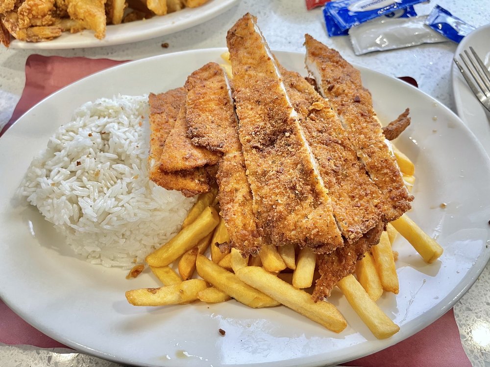 Fried chicken milanesa with rice, french fries, fried sweet plantains, fried eggs.